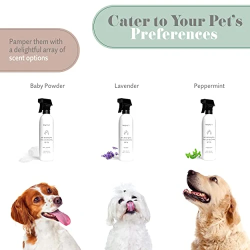 - Aromatherapy for Your Best Bud — If your pet gets tense during grooming, this cat and dog detangler spray dematting conditioner comes in an array of soothing smells for their sensitive souls. Indulge their senses in peppermint, lavender, or baby powder. This scented cat and dog conditioner spray eliminates the wet fur smell and leaves your pet smelling fresh straight from the bath