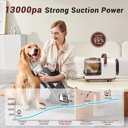 - Wont scare your pets: After special noise reduction treatment, the working sound of the dog grooming vacuum cleaner is as low as 50db, 3 adjustable suction levels are available, we recommend massaging and feeding your pet before trimming pet hair, so that your pet can enjoy Feel relaxed and not intimidated while grooming.
