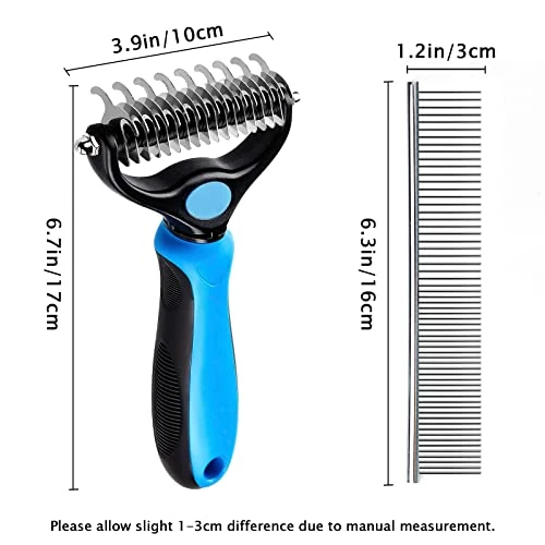 - Dog Rake With Double-Sided Head: Our undercoat rake for dogs features a two-sided head with higher and lower density teeth, one side of the undercoat rake has 9 teeth for brushing out larger knots and tangles, the other side has 17 teeth for quickly thinning and shedding. This right undercoat rake can help your dog’s coat achieve pro grooming results, changes from messy to a wonderfully smooth and soft. It is perfect for long haired and double coated dogs and cats.