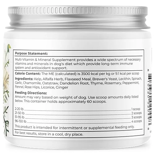 - Holistic formula using only natural (nothing synthetic) ingredients, including Kelp, Alfalfa Herb, Flaxseed Meal, Brewer’s Yeast, Lecithin, Spinach, Garlic, Chamomile, Oatstraw, Dandelion Root, Thyme, Rosemary, Peppermint, Fennel, Rose Hips, Licorice, Ginger