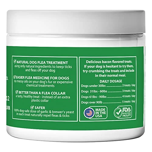 - SAFER: Our active ingredients are a 100% dog-safe dose of garlic & brewer’s yeast in each treat. They work together as a natural tick and flea control for dogs – an avoids any flea spray for home.