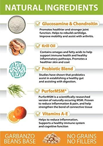 - Joint Health With Glucosamine – Our All-Natural Soft Chews Have Higher Amounts Of Glucosamine, Turmeric, & Purformsm Than The Rest. The Ingredients Are Proven To Reduce Joint Inflammation And Increase Mobility And Flexibility.