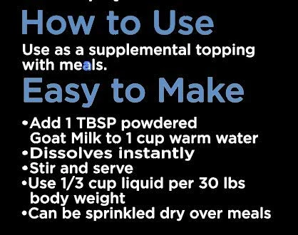 - DONβT PAY FOR DILUTED GOAT MILK β Just Add Water to Our Powdered Goat Milk to Create a Nutrient Rich Liquid Milk. Use as a Liquid Treat, to Moisten Food or, Sprinkle Over Food as a Dry Meal Topper. From our Kitchen to yours, Natureβs Diet Whole Cream Goat Milk is as easy to make as it is delicious.