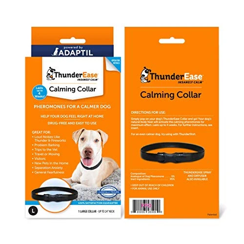 - EASY TO USE: Simply pop on you dog’s ThunderEase collar and go. Your dog’s natural body heat will activate the calming pheromones, which will keep them calm all day long, both at home, and on the go! Each collar lasts up to 4 weeks.