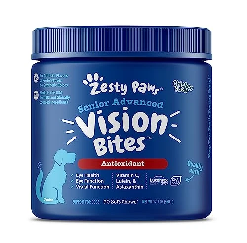 - Daily Eye Care Soft Chews – Zesty Paws Senior Vision Bites are chewable supplements designed to promote eye health for senior dogs of any breed or size.