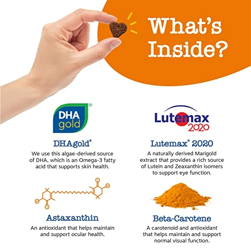 - Eye Health – Each bite contains AstaZine, a certified organic Astaxanthin that supports ocular health, while Beta Carotene supports normal visual function.
